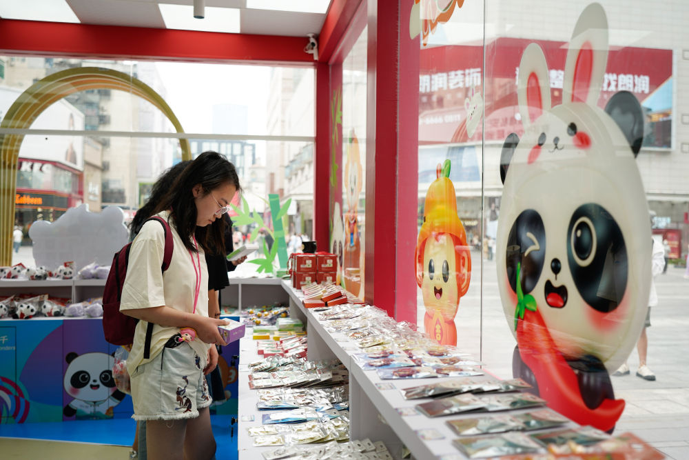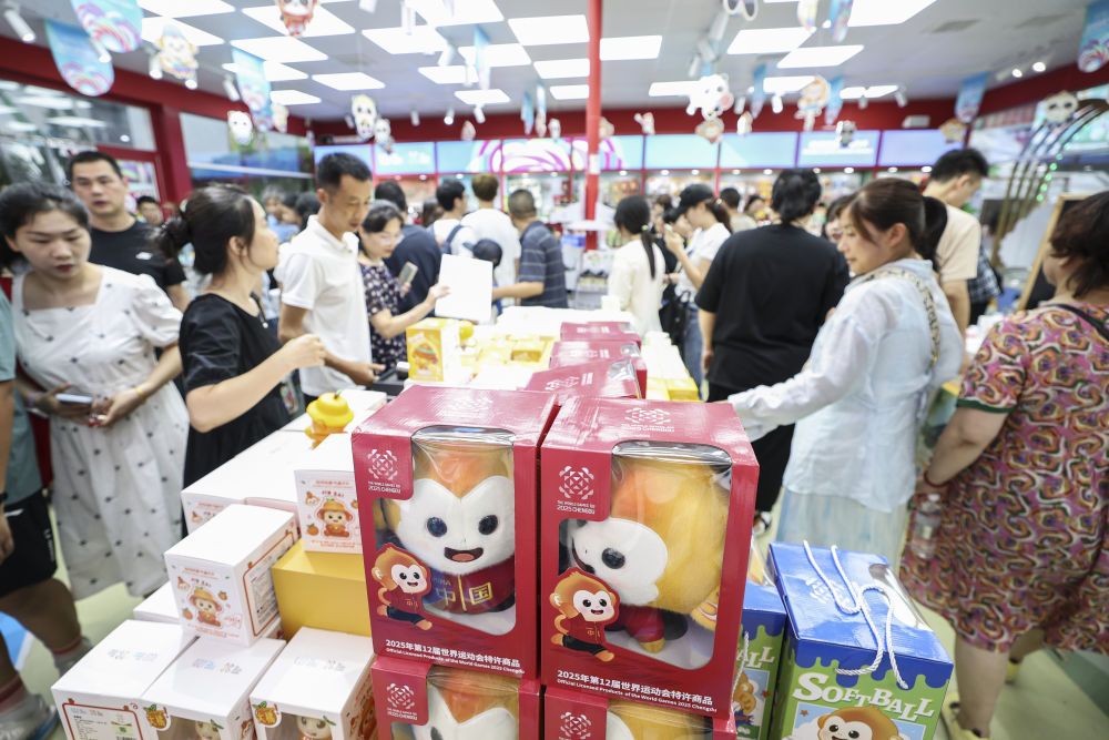 ↑7月8日,顧客在成都春熙路的一家世運會官方特許商品零售店選購。新華社記者胥冰潔攝