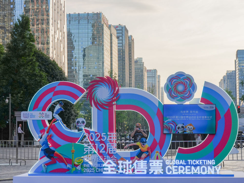 ↑6月30日,游客在成都世運會全球售票主題裝置前拍照。新華社記者王曦攝