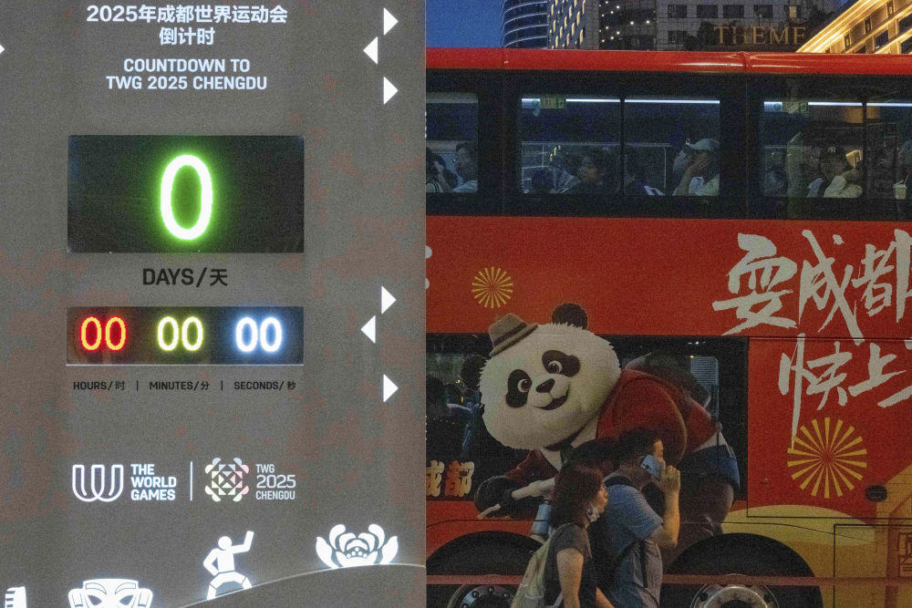 ↑8月7日,在成都天府廣場,人們走過世運會倒計時牌。新華社記者謝劍飛攝