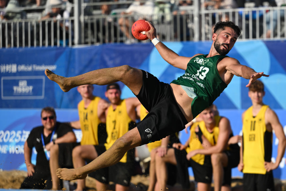 ↑8月12日,葡萄牙隊球員科斯塔在世運會沙灘手球男子決賽中進攻。新華社記者陳振海攝