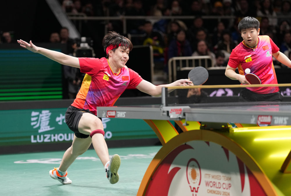 ↑2024年12月8日,中國隊選手王楚欽(左)/孫穎莎在2024年成都國際乒聯混合團體世界杯決賽中。最終,中國隊獲得冠軍。新華社記者江宏景攝