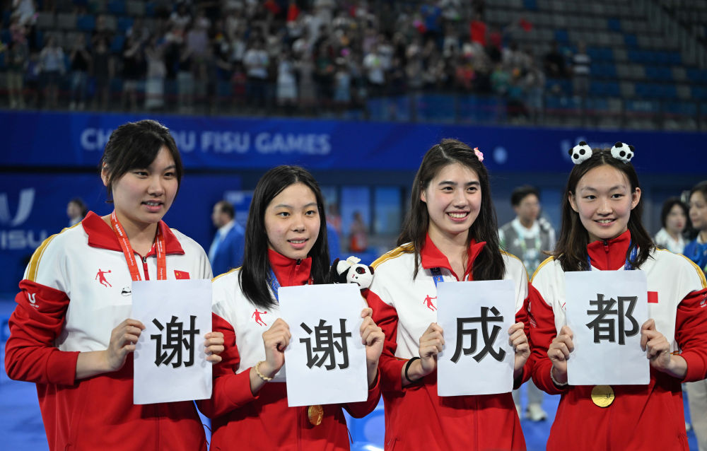 ↑2023年8月7日,在成都大運會游泳比賽現場,中國女子4x100米混合泳接力隊手持“謝謝成都”標語合影。新華社記者張龍攝