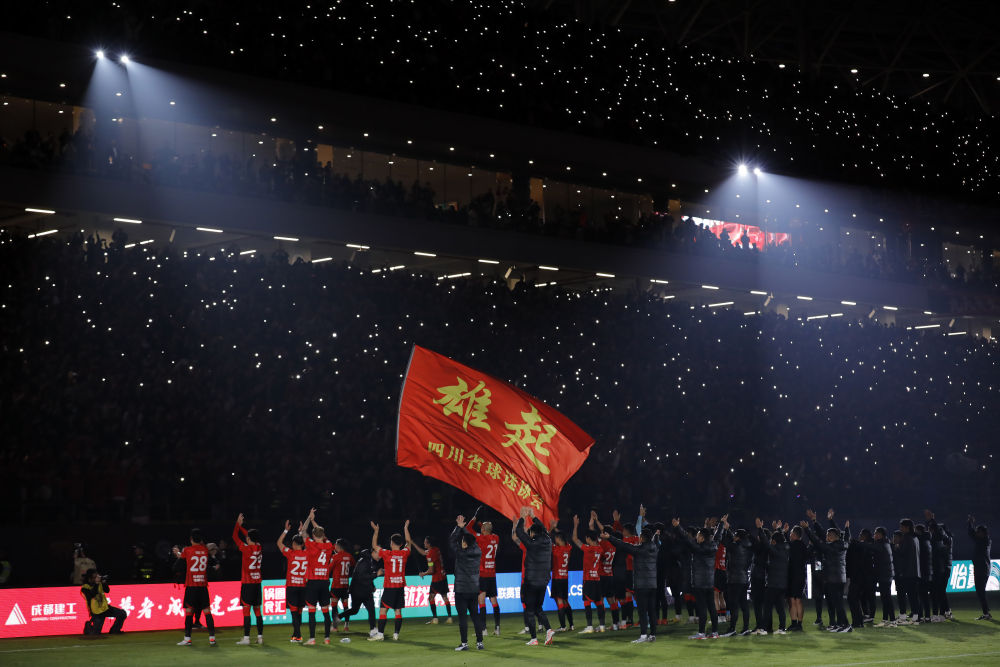 ↑2024年3月2日,成都蓉城隊球員在中超比賽后與現場球迷互動。新華社記者沈伯韓攝