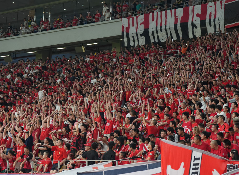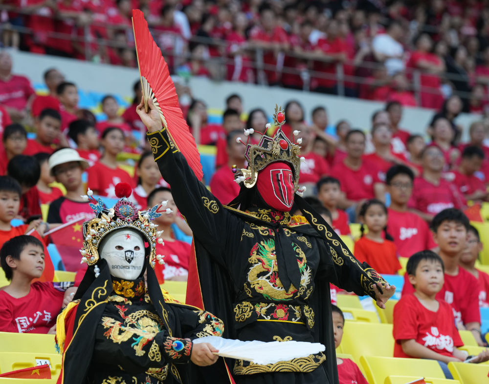 ↑8月12日,在亞冠附加賽現場,身著當地特色服飾的球迷為球隊加油助威。新華社記者 王曦 攝