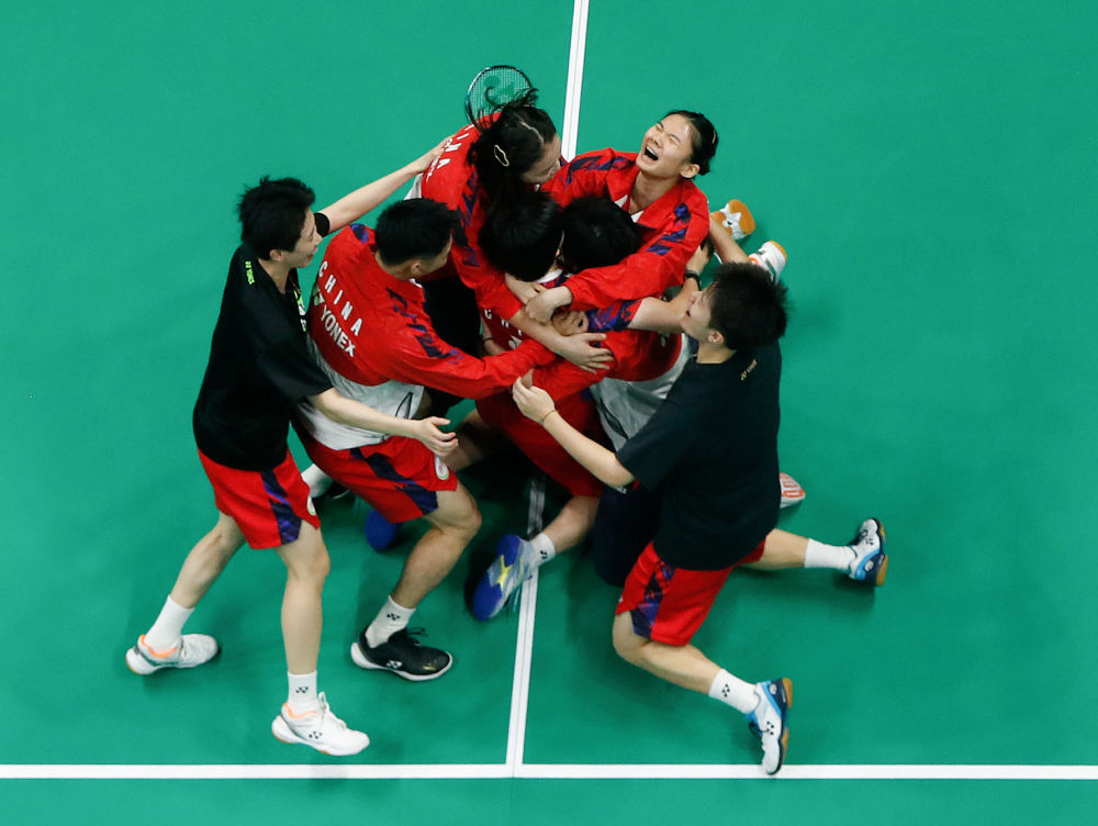 ↑2024年5月5日,中國隊慶祝奪得2024年尤伯杯冠軍。新華社記者賈浩成攝