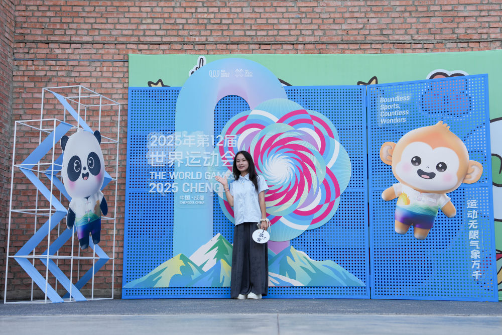 ↑8月7日,在成都東郊記憶·成都國際時尚產業園,游客在世運會主題展板前留影。新華社記者李旭倫攝