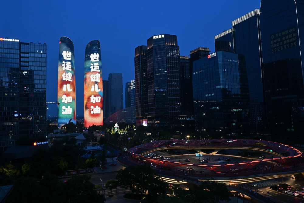 ↑這是8月7日拍攝的成都雙子塔世運會主題燈光秀。新華社記者楊文斌攝
