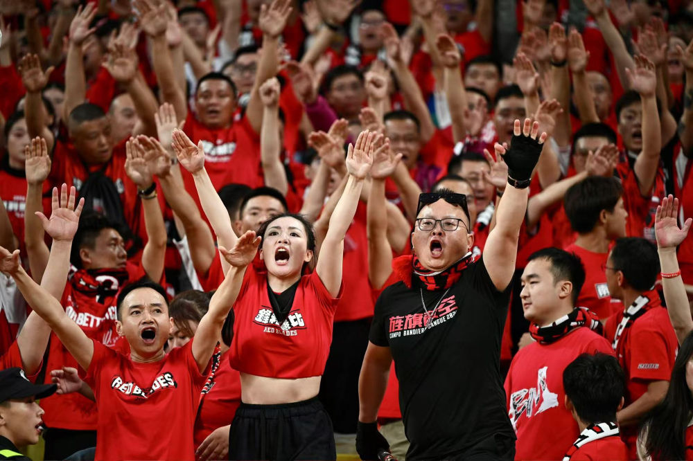 ↑8月12日,在亞冠附加賽現場,成都蓉城隊球迷為球隊加油助威。新華社記者王曦攝