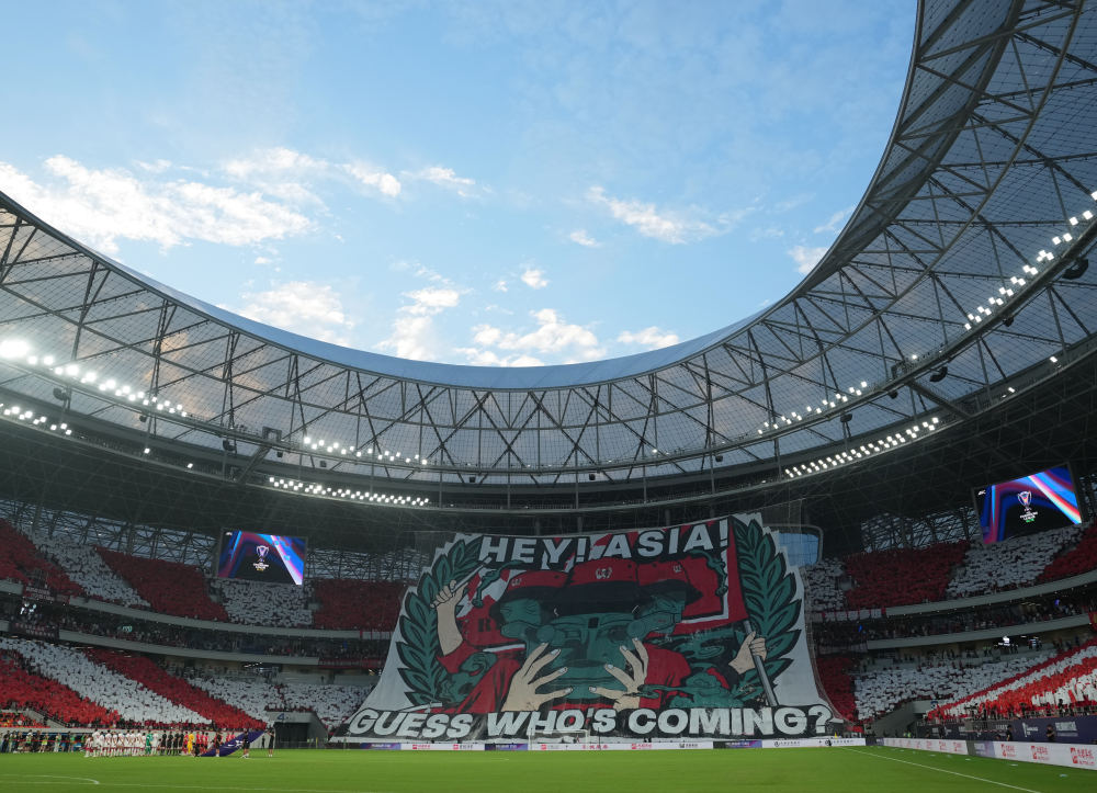 ↑8月12日,在亞冠附加賽現場,成都蓉城隊球迷在賽前觀眾席上打出巨幅TIFO(可覆蓋看臺的大型橫幅或拼圖)。新華社記者王曦攝