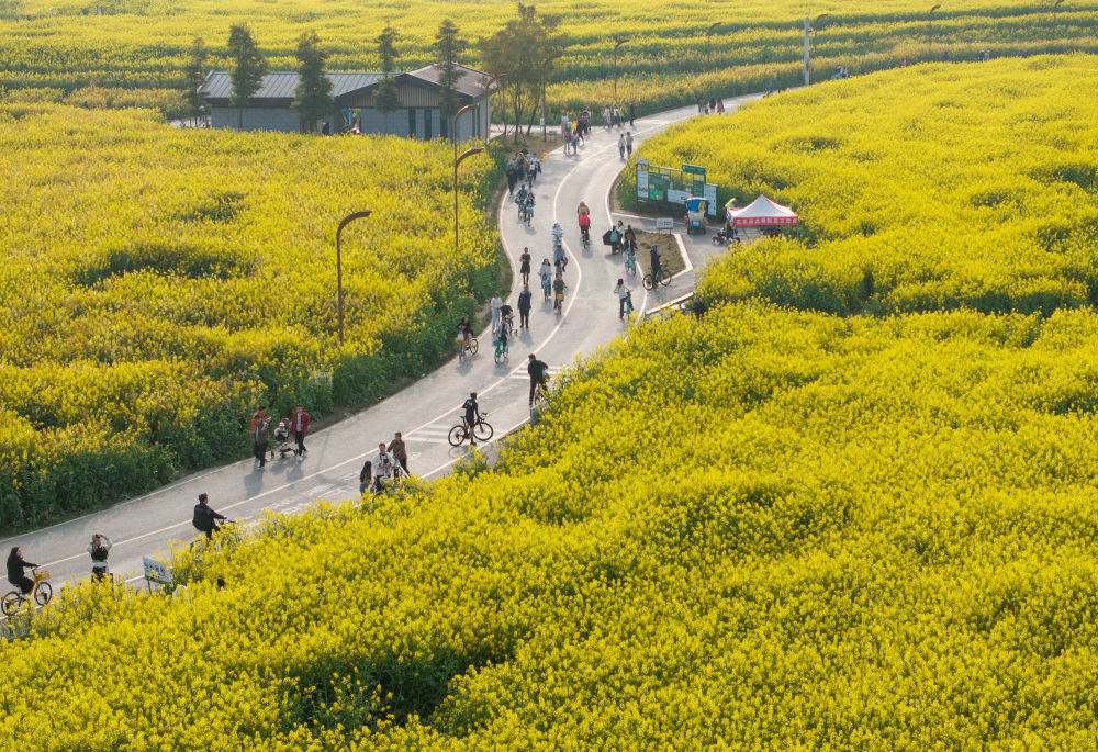 ↑3月13日,人們在成都高新區一處油菜花田旁騎行(無人機照片)。新華社記者江宏景攝
