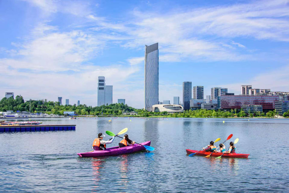 ↑7月26日,人們在成都市興隆湖體驗皮劃艇。新華社發(張治平攝)
