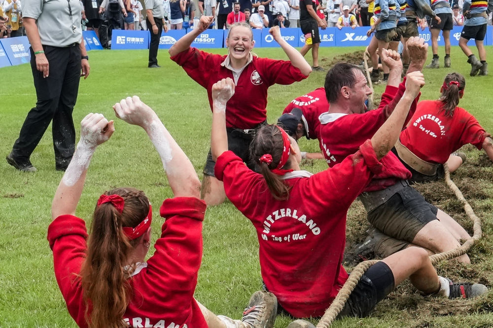 ↑8月11日,瑞士隊隊員在世運會混合室外拔河580公斤級賽后慶祝。新華社記者李博攝