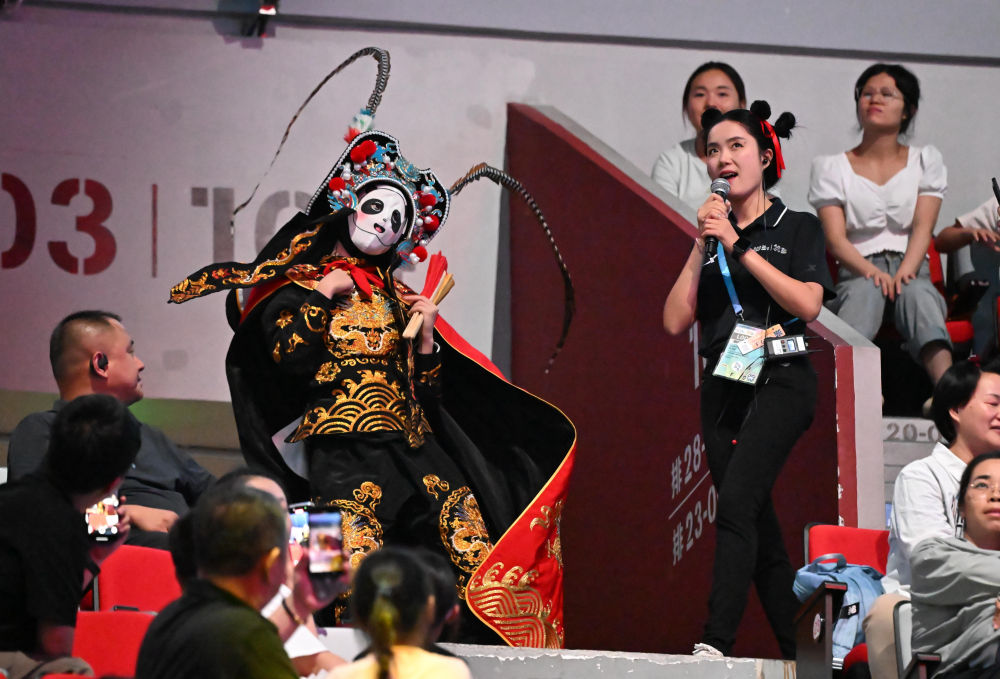 ↑8月10日,川劇變臉表演者在世運會蹦床比賽前暖場。新華社記者孫凡越攝