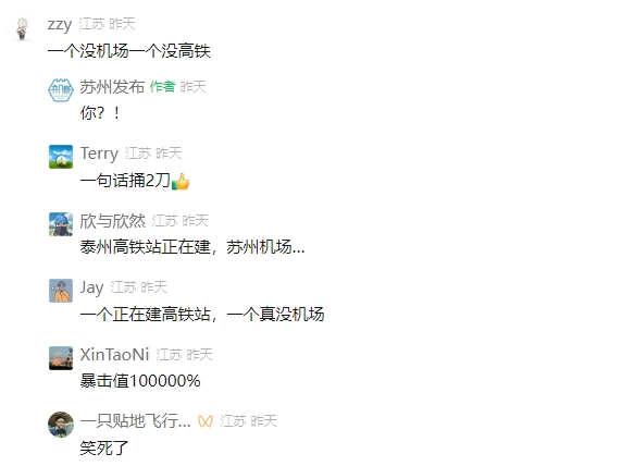 “蘇州發布”評論區截圖(冷知識:其實泰州是沒高鐵站)