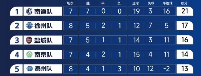 江蘇省城市足球聯賽目前積分榜前五
