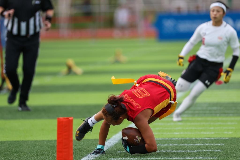 本場比賽日本隊的四分衛巖田千尋展現了亞洲頂級的實力,她在第一檔進攻中的傳球就越過中國隊5碼線,隨后又助攻隊友成功達陣并拿得1分附加分。日本隊的防守持續給中國隊造成壓迫,直到上半場倒計時四分半左右時,馮浩霖才助攻高子旋成功達陣,緊接著又助攻吳燕然獲得1分附加分,將比分扳為7:7。
