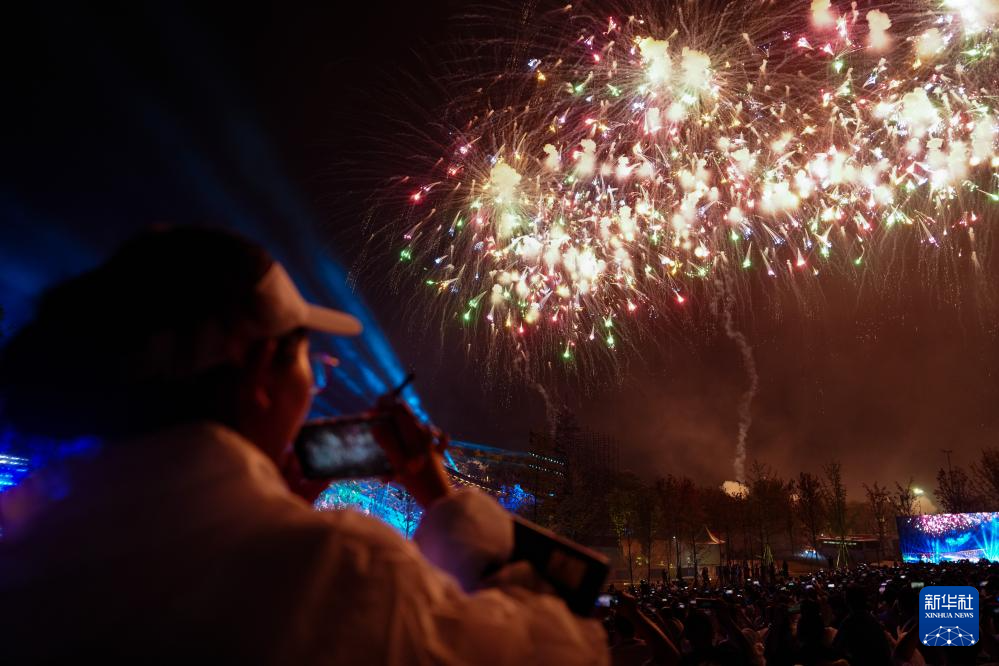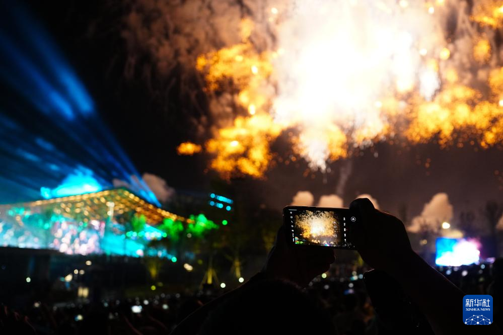 8月17日,觀眾在閉幕式現場拍攝焰火表演。