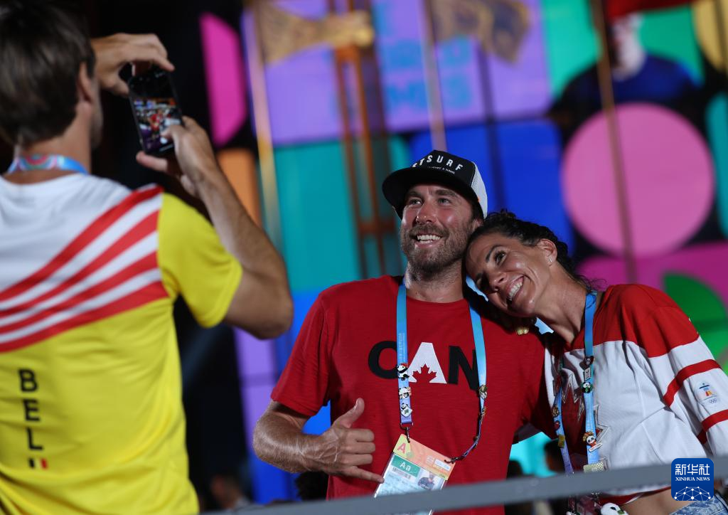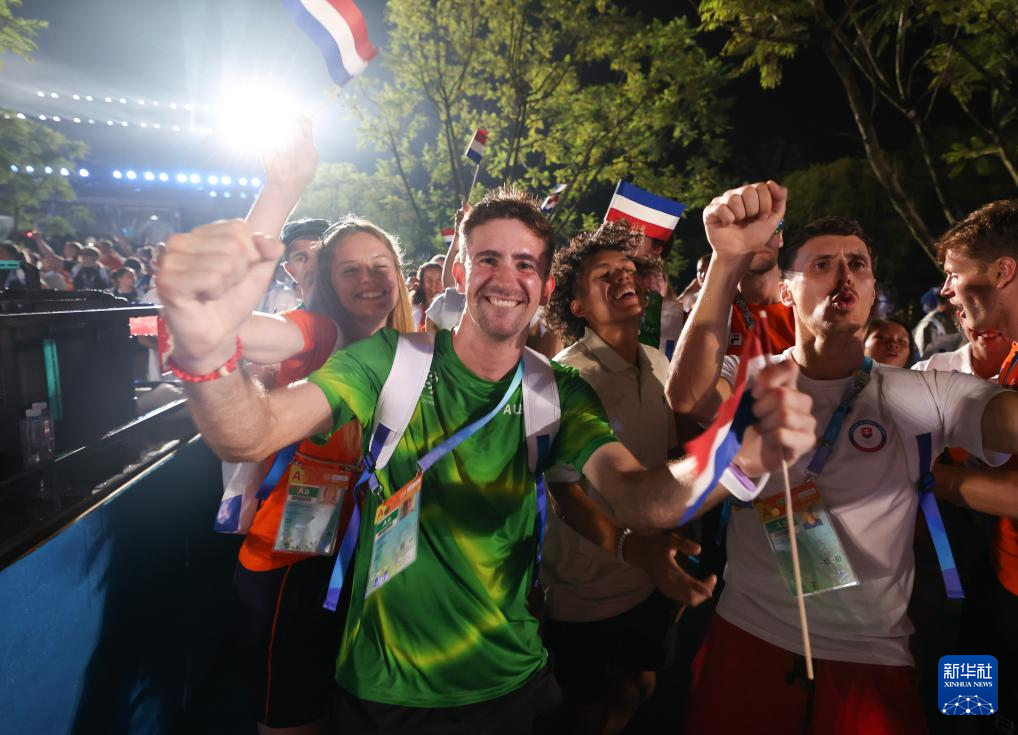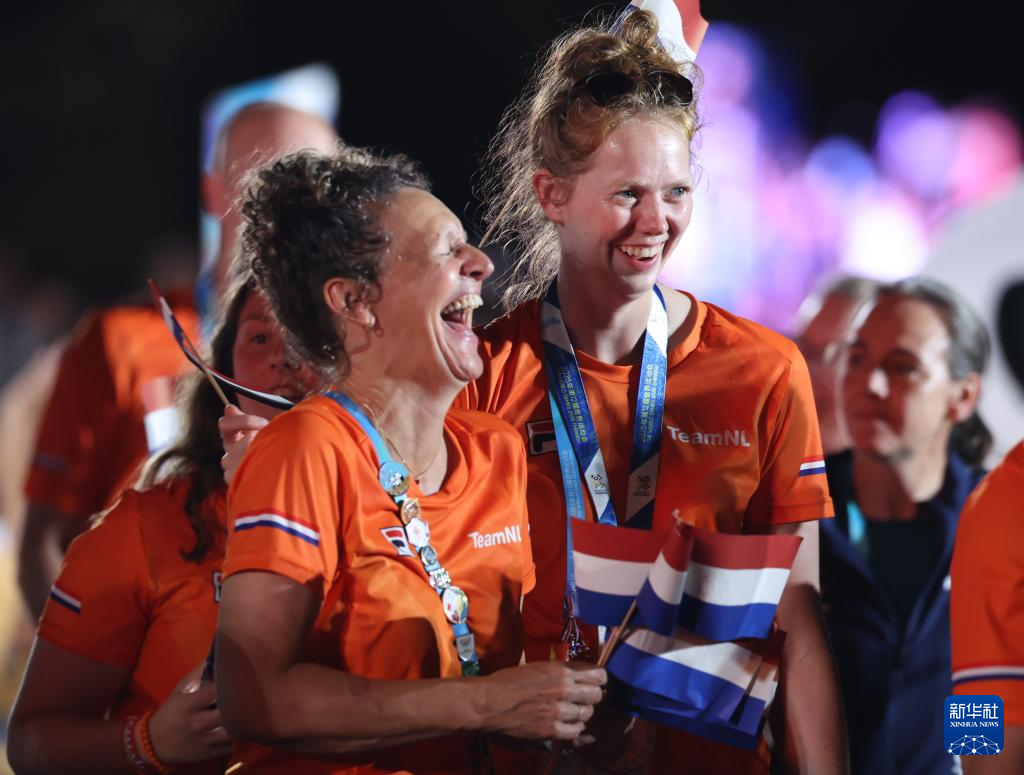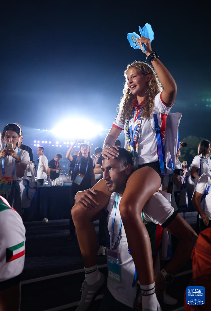 8月17日,演員(前右)與運動員在閉幕式上互動。
