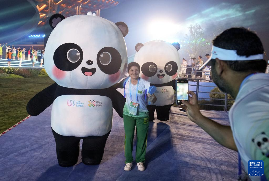 8月17日,觀眾在閉幕式上與本屆世運會吉祥物“蜀寶”(后)合影。