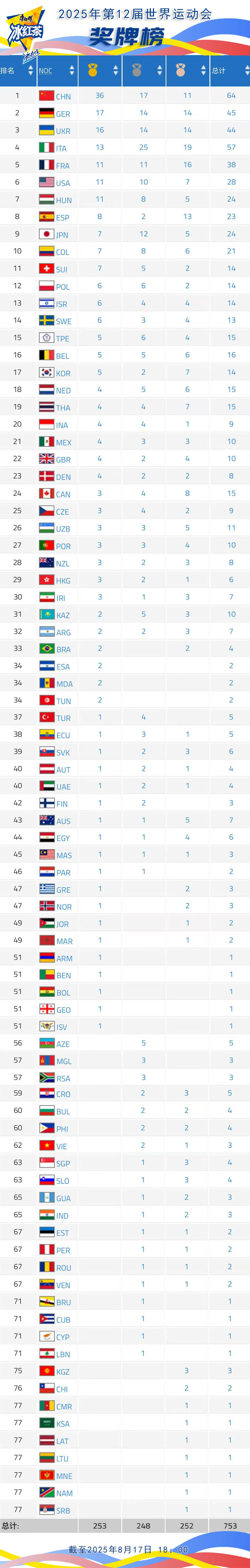 第12屆世界運動會獎牌榜(截至8月17日)-新華網