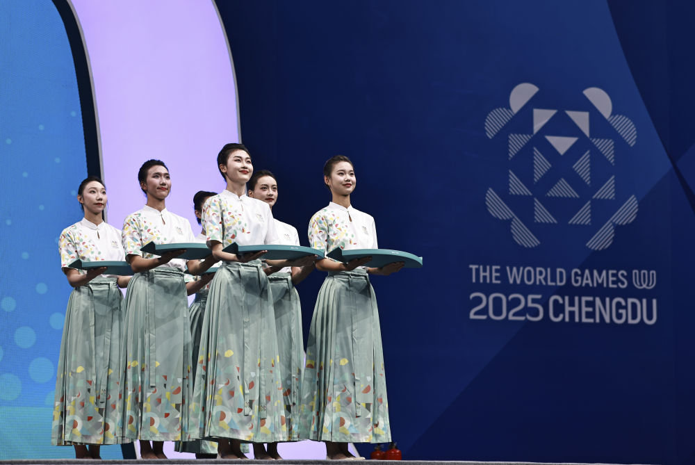 8月8日,志愿者在成都世運會技巧女子雙人項目頒獎儀式上。新華社記者 孫凡越 攝
