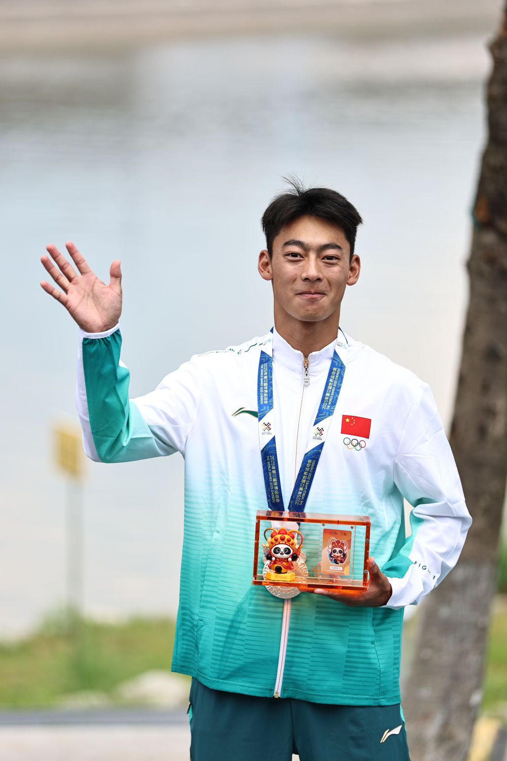 8月17日,男子動力沖浪板亞軍中國選手張茂竹在頒獎儀式上。新華社記者 孫凡越 攝