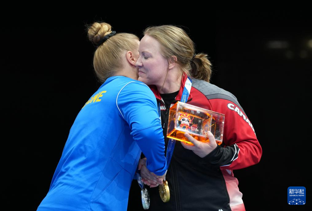 8月17日,冠軍加拿大選手施廷(右)與亞軍烏克蘭選手達里婭在頒獎儀式上擁抱。