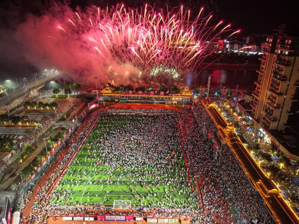 7月26日,貴州“村超”球場拍攝的煙花秀(無人機照片)。當日,貴州榕江舉行主題為“感恩重啟·貴州超力量”的超級星期六活動,球星巴喬、卡洛斯現場助陣,助力“村超”重燃賽事,正式回歸。新華社記者 楊文斌 攝