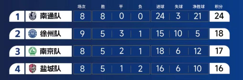 江蘇省城市足球聯賽目前積分榜前四