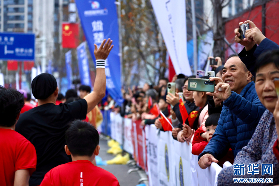2024年11月23日,觀眾在道路兩側為參賽選手加油。當日,2024廣安馬拉松賽鳴槍開跑。新華網發(張可凡攝)