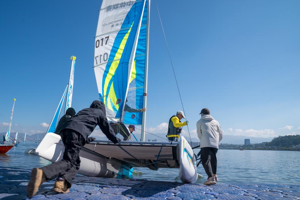 2024年10月26日,參加中國萬水千帆賽(大理站)比賽的船只從出發點下水。當日,2024中國戶外運動產業大會正式啟幕。作為大會四大板塊之一的“賽事活動”也于當日開賽?!百愂禄顒印卑鍓K共涵蓋4場國家級賽事,分別是大理環洱海自行車賽、中國萬水千帆賽(大理站)、大理徒步行以及古城人車定向挑戰賽。新華社記者 彭奕凱 攝