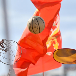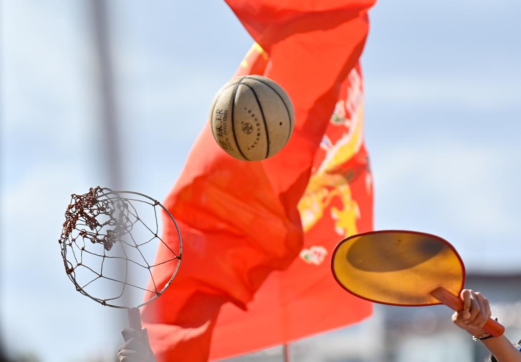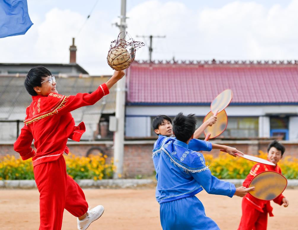 9月16日,烏拉街滿族中學學生在比賽中爭奪珍珠球。