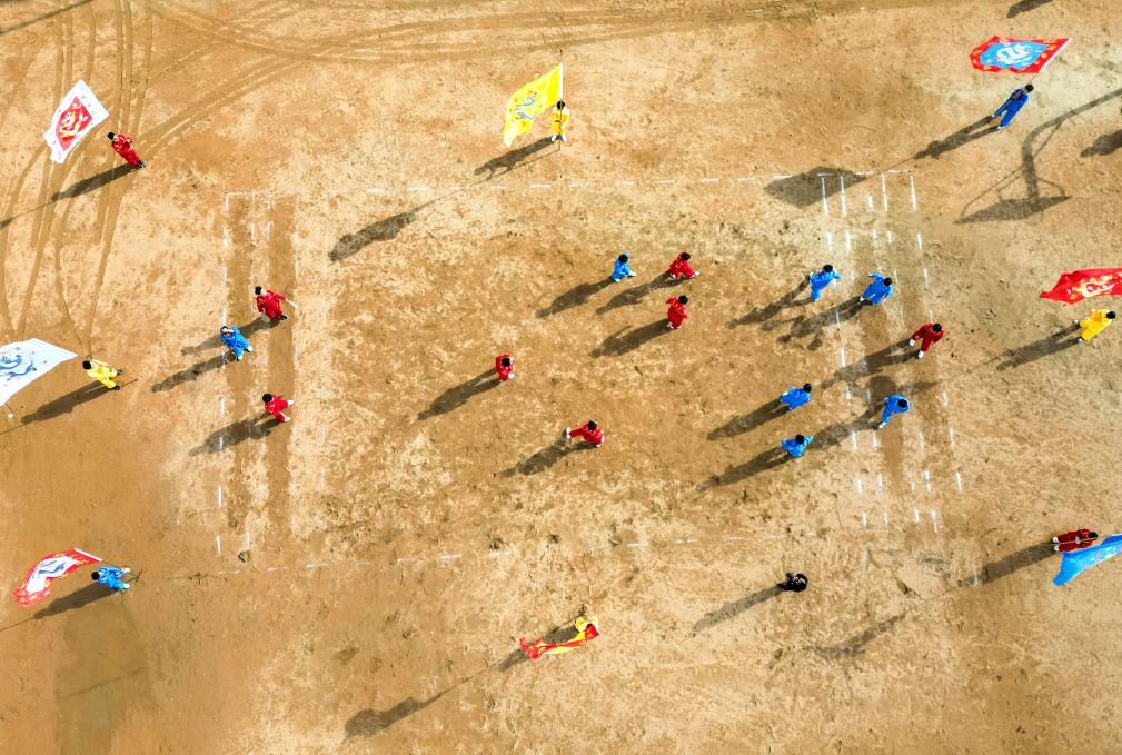 9月16日,烏拉街滿族中學學生在操場進行珍珠球比賽(無人機照片)。