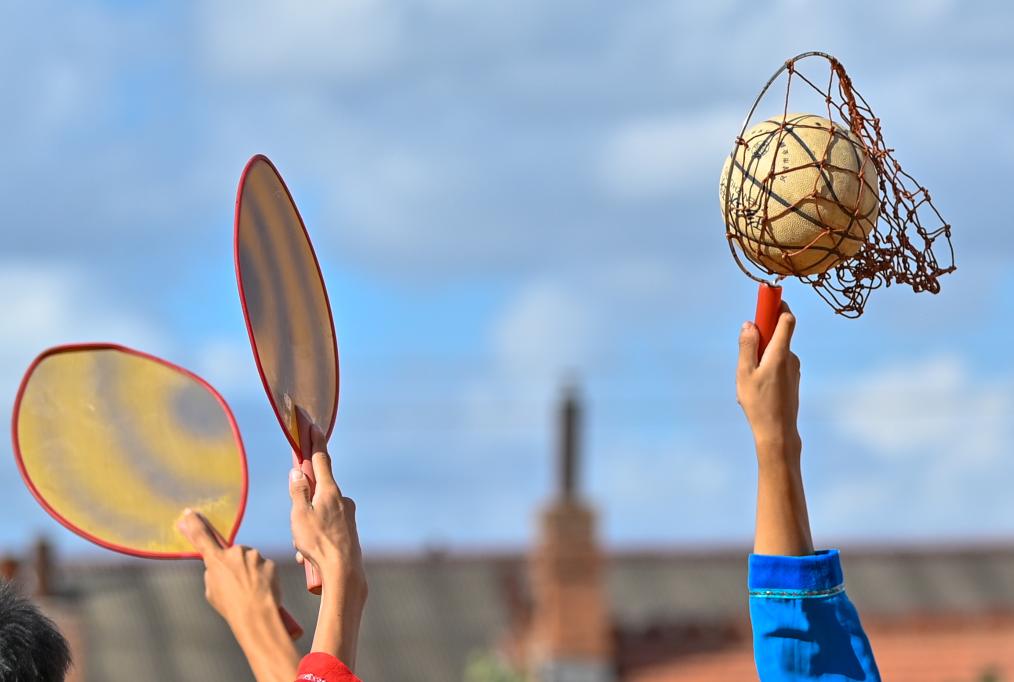 9月16日,烏拉街滿族中學學生在比賽中接住珍珠球得分。