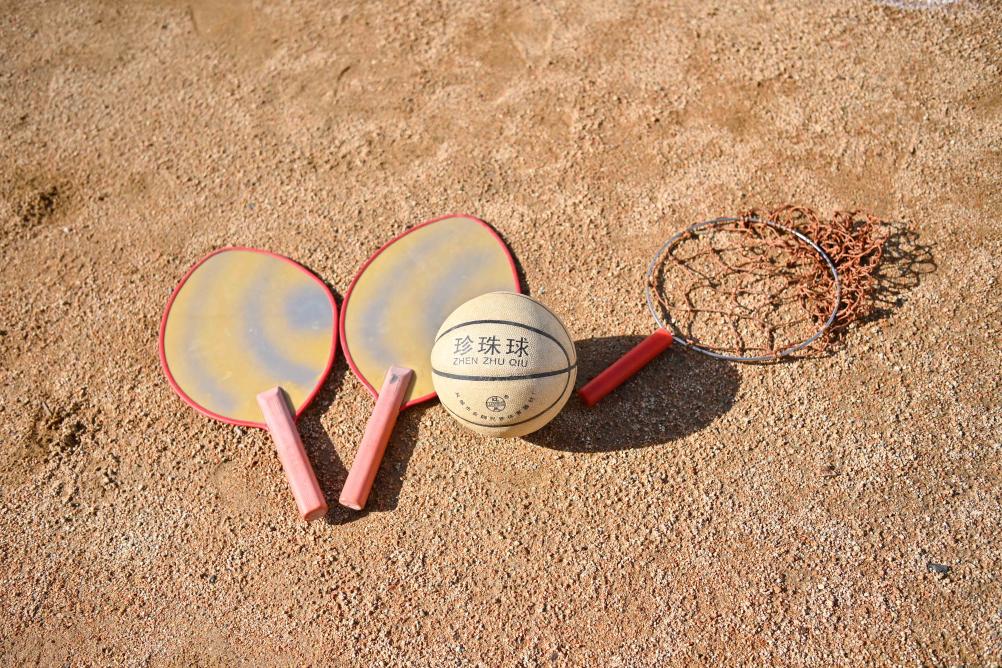 這是9月16日拍攝的珍珠球比賽中用到的球拍、珍珠球以及抄網。