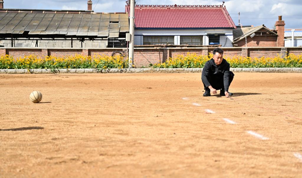 9月16日,烏拉街滿族中學體育教師李明在操場上為珍珠球比賽場地畫線。