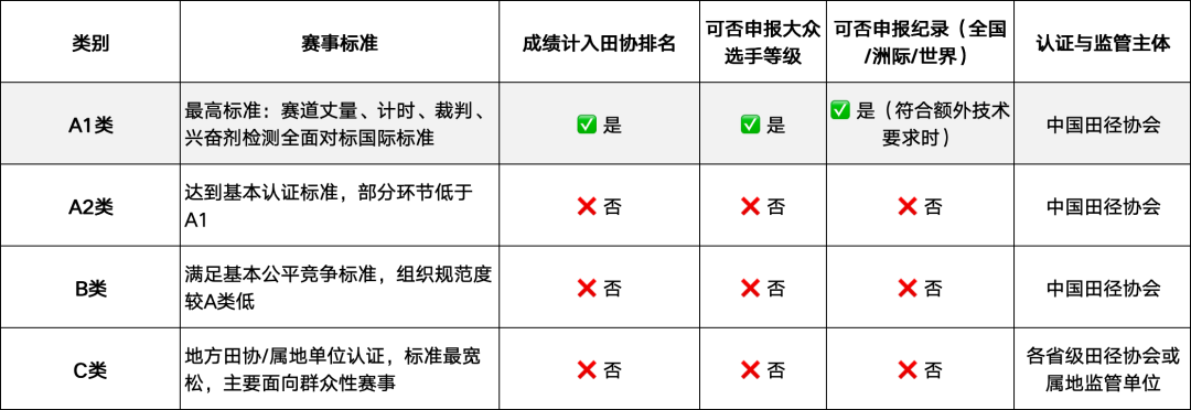 根據《中國田徑協會路跑賽事管理辦法》,A類賽事為中國田徑協會認證賽事的最高等級,細分為A1和A2兩個級別。其中,A1類賽事要求的賽道、丈量、距離、計時、裁判、興奮劑檢測等核心競賽組織工作達到世界田聯、全國紀錄、成績認證標準(承認紀錄及達標成績),是中國田徑協會認證馬拉松賽事的頂級序列。