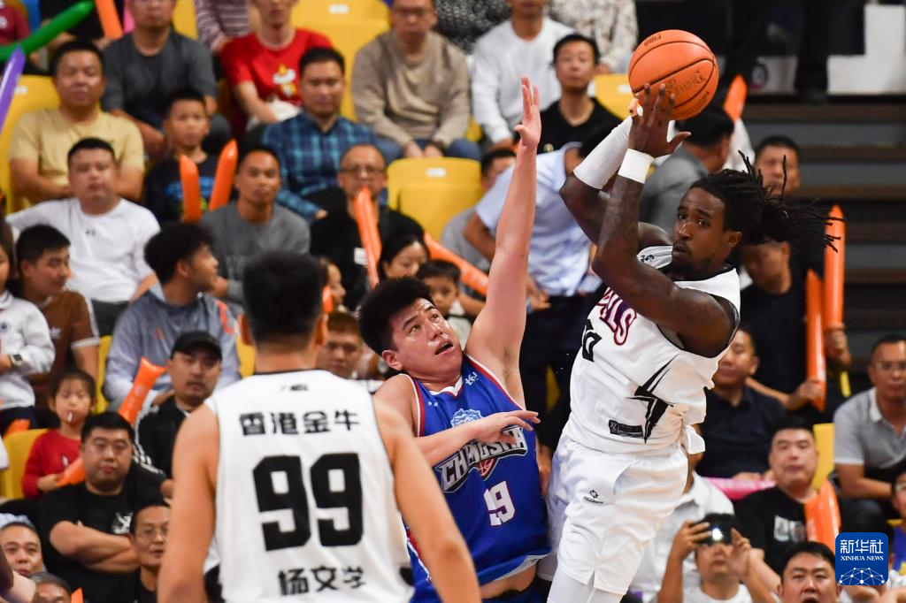 9月22日,香港金牛隊球員凱文·克羅斯(右一)防守長沙電信勇勝隊球員達卡里·約翰遜(中)上籃。