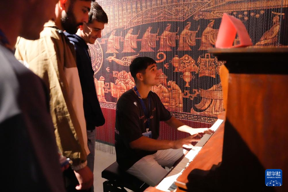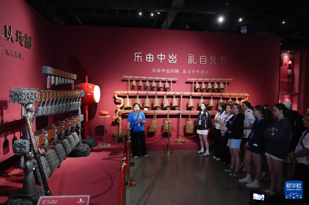 9月23日,球員們在世界音樂文化博物館聆聽講解員介紹編鐘。