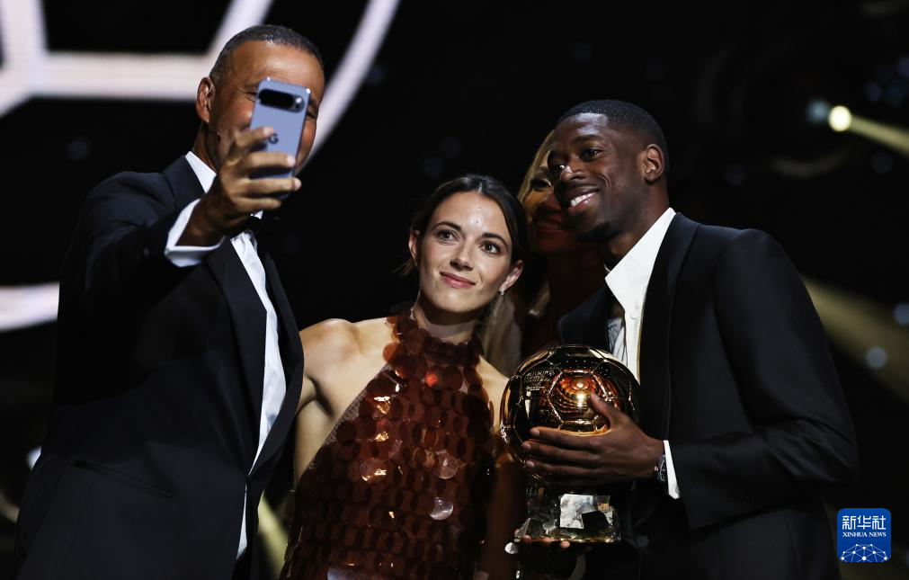 9月22日,男足金球獎獲得者登貝萊(右一)、女足金球獎獲得者邦馬蒂(左二)在頒獎典禮上與主持人自拍合影。
