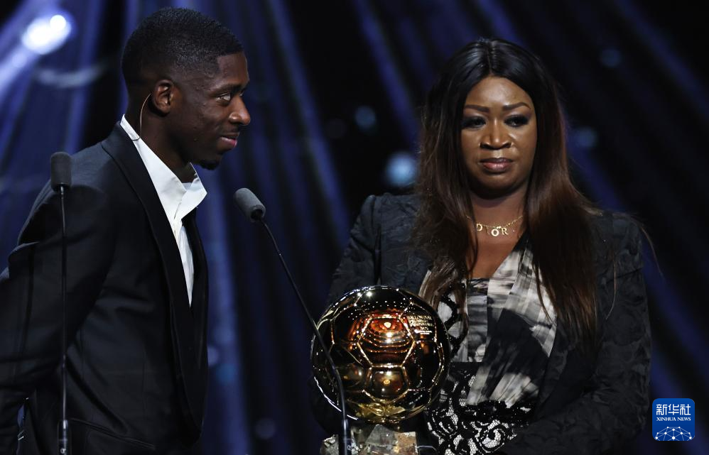 9月22日,巴黎圣日耳曼隊法國球員登貝萊(左)與母親在頒獎儀式上。登貝萊獲頒男足金球獎。