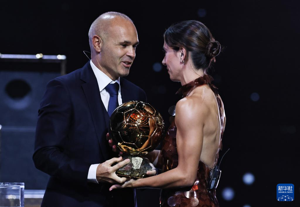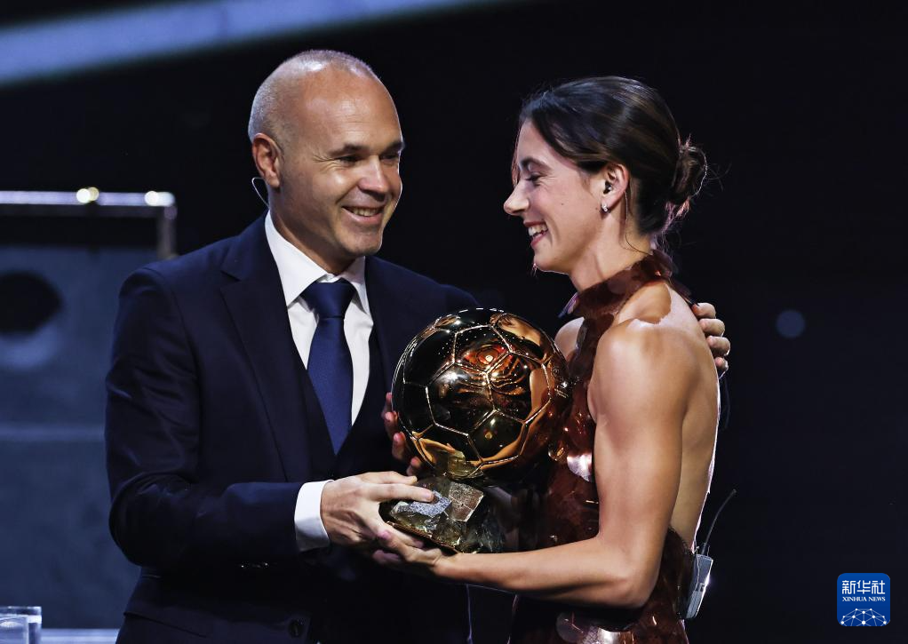 9月22日,巴塞羅那隊西班牙球員邦馬蒂(右)在頒獎儀式上從西班牙足球名宿伊涅斯塔手中接過女足金球獎杯。這是她連續第三年獲得該獎項。