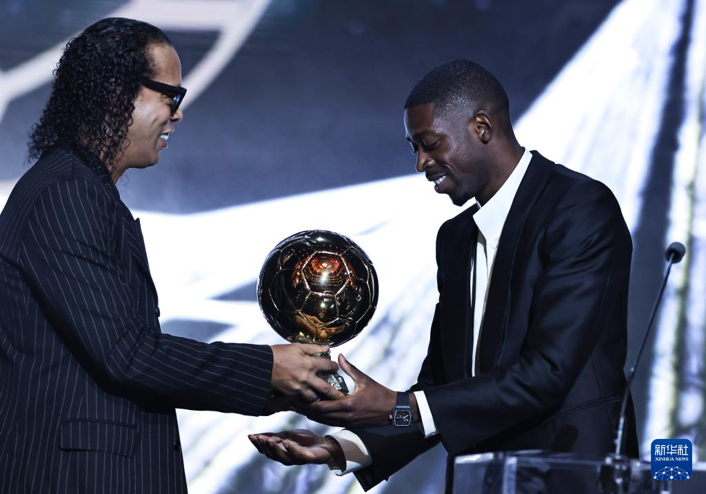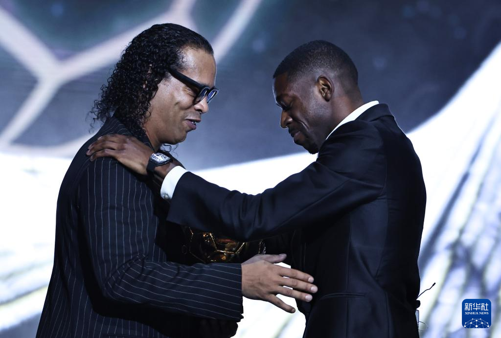 9月22日,巴黎圣日耳曼隊法國球員登貝萊(右)從巴西足球名宿羅納爾迪尼奧手中接過男足金球獎獎杯。