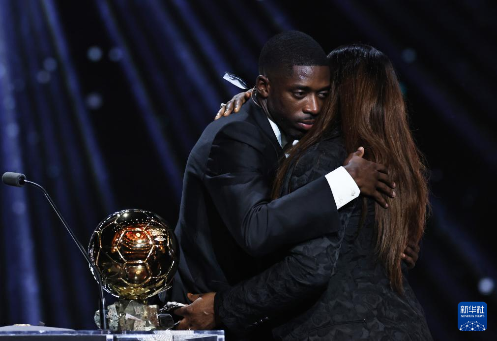 9月22日,巴黎圣日耳曼隊法國球員登貝萊(左)與母親在頒獎儀式上擁抱。登貝萊獲頒男足金球獎。