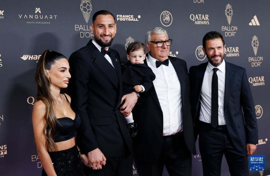 9月22日,巴黎圣日耳曼隊守門員多納魯馬(左二)和家人在頒獎典禮紅地毯亮相。多納魯馬獲頒象征最佳門將的雅辛獎。