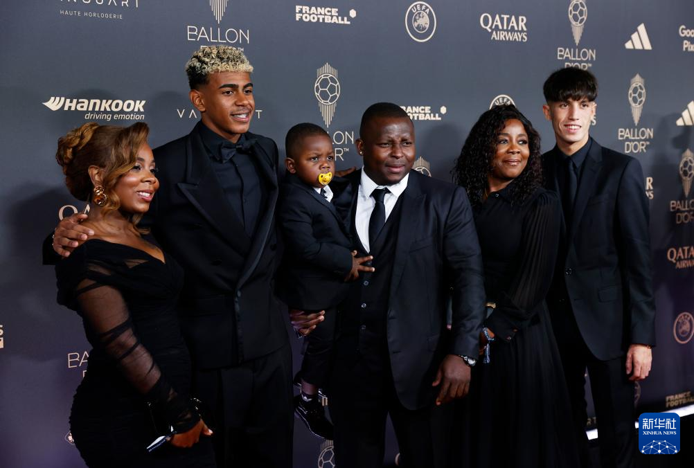 9月22日,西甲巴塞羅那隊球員亞馬爾(左二)和家人亮相頒獎典禮紅地毯。他獲得象征最佳男足年輕球員的“科帕獎”。