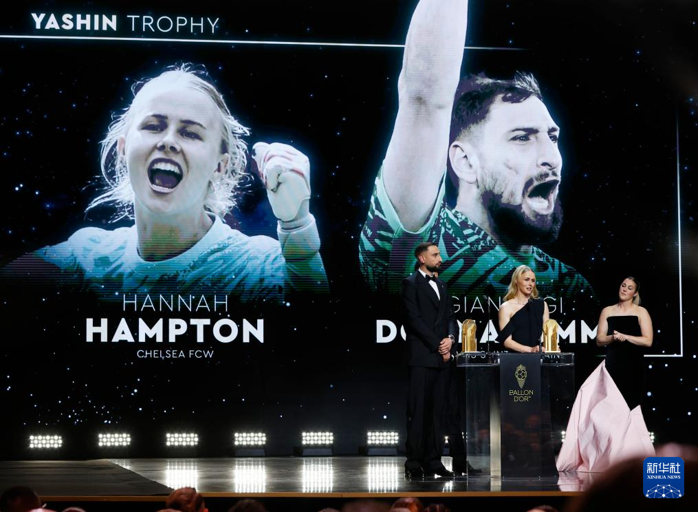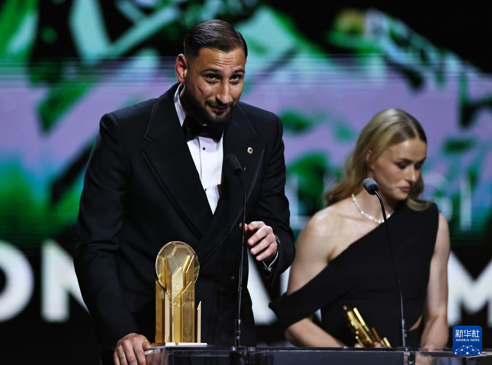 9月22日,巴黎圣日耳曼隊守門員多納魯馬(左)在頒獎儀式上講話。他獲頒象征最佳門將的雅辛獎。
