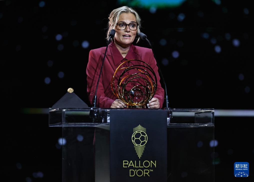 9月22日,英格蘭女足荷蘭籍主教練威格曼在頒獎儀式上講話。她當選女足最佳教練。