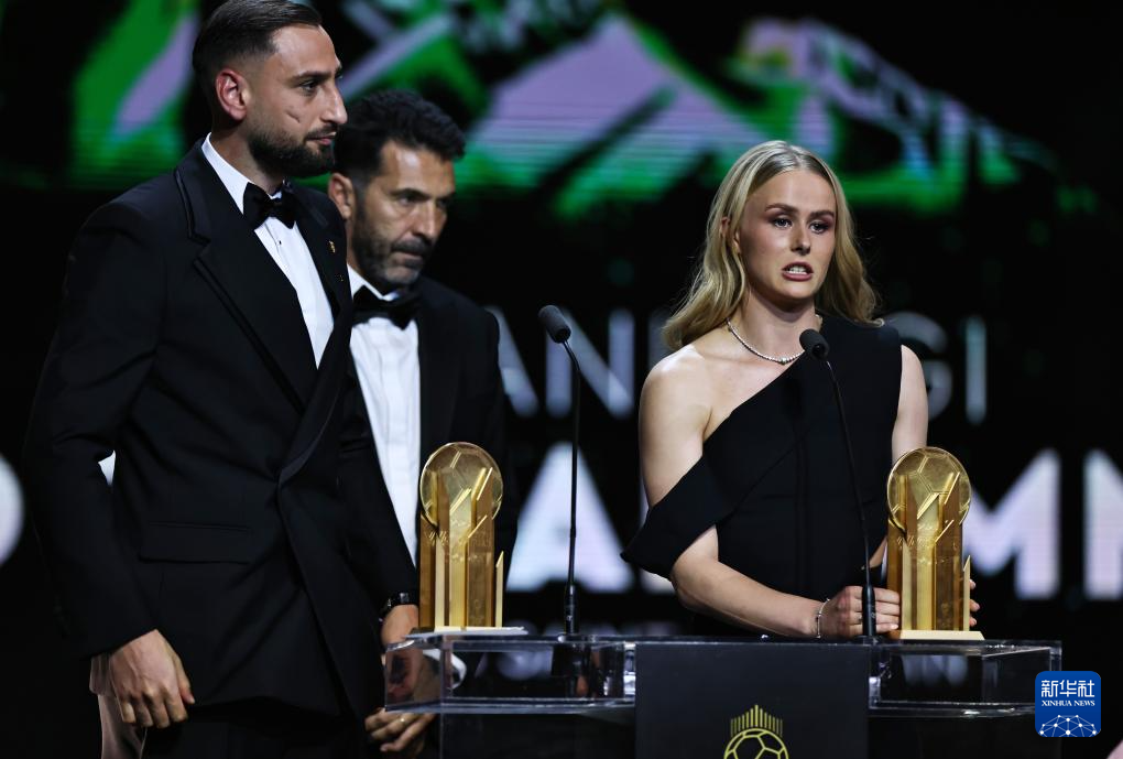 9月22日,巴黎圣日耳曼隊守門員多納魯馬(左)和切爾西女足守門員漢普頓(中)獲頒象征最佳門將的雅辛獎。