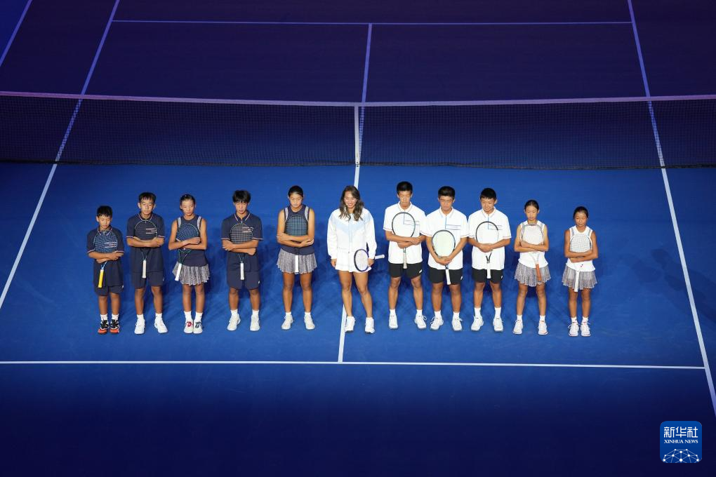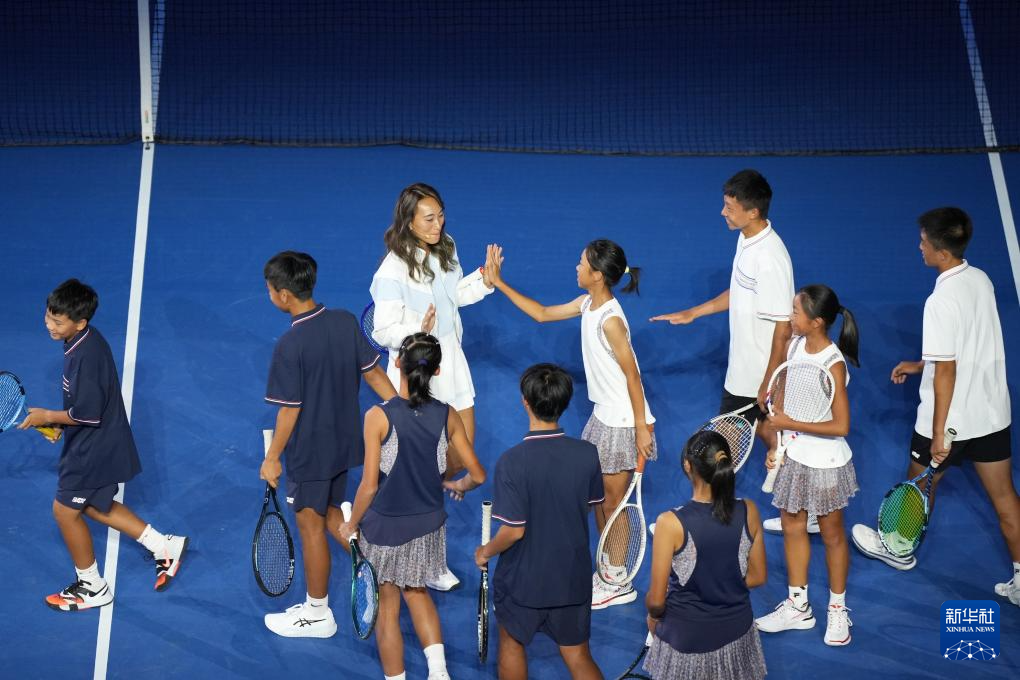 9月23日,中國網球運動員鄭欽文(上左三)在活動中與小運動員互動。